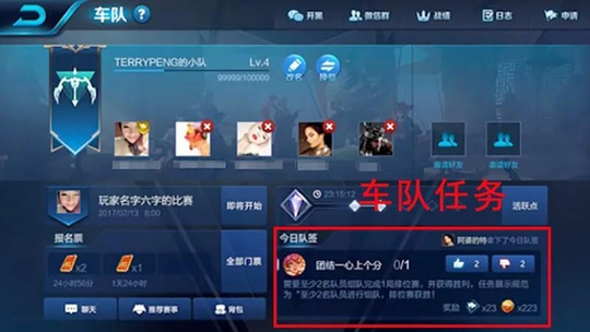 如范例的这个任务,就是让至少两名车队的成员组队赢取排位赛,完成后就能获得金币(钻石、铭文碎片)和新物品——车队币!