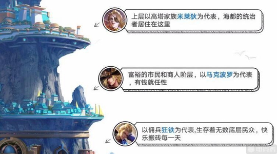 在背景故事中,海都的城市结构被分为了三个阶层。像米莱狄这种高贵家族出身,又有女王范的英雄,自然是属于最顶尖的统治者代表;像马可波罗这种从商的富豪,也是本着“有钱就是任性”的原则,代表着海都的中层阶级;最后一个阶层就是基数最大的劳苦群众,身强力壮的狂铁就是其中之一,每天以搬砖维持生计。