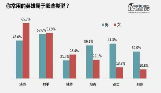 女性玩家最常用的英雄类型是法师(65.7%),不爱刺客(10.8%)和战士(13.3%)。