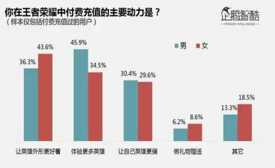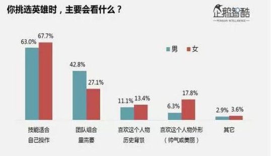 这是因为女性玩家挑选英雄时看外形的占比(17.8%)高于男性(6.3%)。此外,让英雄更好看是女性玩家的第一付费动力。