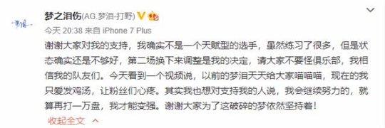 谢谢大家对我的支持,我确实不是一个天赋型的选手,虽然练习了很多,但是状态确实还是不够好,第二场换下来调整是我的决定,请大家不要怪俱乐部,我相信我的队友们。今天看到一个视频说,以前的梦泪天天给大家喵喵喵,现在的我只爱发鸡汤,让粉丝们心疼。其实我也想对支持我的人说,我会继续努力的,就算再打一万盘,我才能变强。谢谢大家为了这破碎的梦依然坚持着!