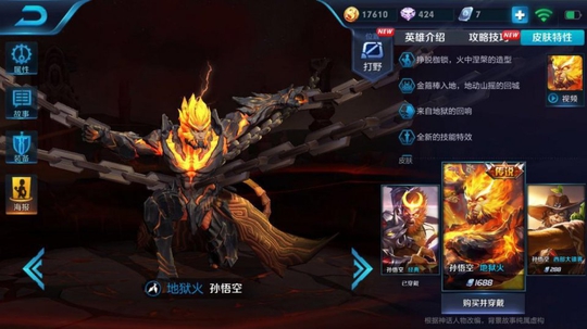 第二名孙悟空的地狱火,目前在王者荣耀中销量第一的皮肤就是孙悟空的地狱火,在游戏里10个猴子9个有地狱火,地狱火得到美术优化后出场也更是震撼人心