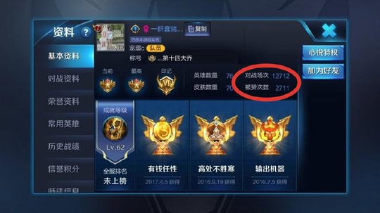 每次遇到特别强的对手,小黑龙都忍不住回去看一下玩家的资料。然而这位V7的女玩家对战场次竟然高达12700多场,这是一个什么样的女玩家啊,这对战场次不看不知道,一看完全吓一跳,这也太猛了吧。身为一个女玩家不仅是一个荣耀王者的段位,,而且英雄也达到了76个,皮肤也有70个,最让小黑龙惊讶的是她的对战场次,这样的对战场次骨灰级老玩家都自愧不如啊。
