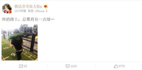 原来,在张大仙最近的一条微博里面,也不知道我们的张大仙是要去干什么,反正是在自己的脖子上面套上了一个绿色的看上去有点像是游泳圈的玩意。然后,我们的张大仙还特别淡定的自我调侃,说是帅的路上,总要肩负一点绿……