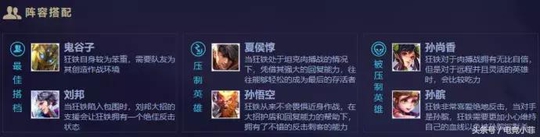 根据官方给出的资料,狂铁的定位属于近战式英雄,搭配辅助和坦克比较好打,但是面对灵活性高的射手比如孙尚香却处于克制状态,但让人想不到的是狂铁惧怕的英雄还有孙膑,在开启大招状态下狂铁能恢复血量,但是对孙膑的沉默就有点劣势。