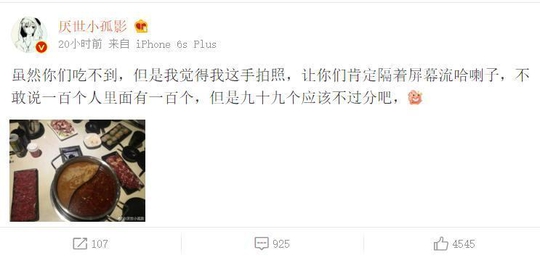孤影自己是这样子说的:虽然你们吃不到,但是我觉得我这手拍照,让你们肯定隔着屏幕流哈喇子,不敢说一百个人里面有一百个,但是九十九个应该不过分吧。