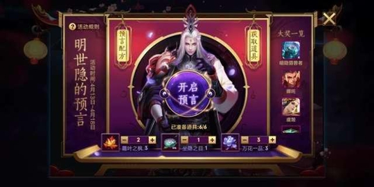 这里只要三样物品都加起来够6个就可以点击开启预言了,并不是说要每个物品都是等同的数才能开启。最让玩家想要等到的就是兰陵王的这款皮肤了。应该也是最有价值的奖品(兰陵王的上场几率视乎不高吧)。