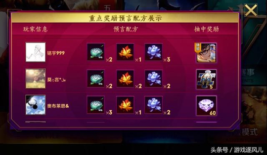 活动中的奖励是不固定的,所以想要通过调制配方得到大奖,这才是重中之重,如果仅仅只得到铭文碎片,那真的是太遗憾了,所以工欲善其事,必先利其器,在活动中会有预言赔方,可以通过其他玩家配方得出来的奖励,而然搭配道具,这样出来的奖励会固定已经,所以想要得到大奖,那就需要多参考一下其他玩家的配方了。