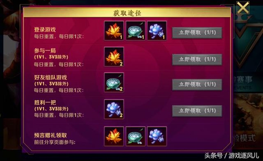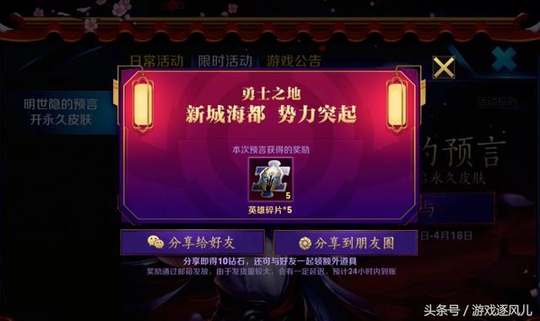 而想要得到预言配方中的道具,玩家可以通过登录游戏,可以直接领取到霜叶之枫、坐隐之目、万花一品道具,还可通过每天的对局,已经和好友组队就可以从获取途径中,领取到对于的物品,相信很多玩家现在已经迫不及待了,毕竟这个活动的奖励还是非常吸引人的,其中的大奖有永久皮肤暗隐狩猎者,已经永久英雄哪吒和虞姬,还有碎片头像框等奖励。