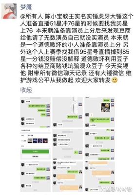而到今天,王者荣耀最大演员团伙的头子陈小宝公开实锤虎牙大锤,称他勾结豆商骗观众豆子。而且陈小宝公开了两人的聊天记录,证明大锤曾找过自己买星。这个演员头子非常生气,连大锤的微信号都被他公布了。