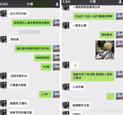 在聊天记录中,这个演员头子表示:“高星局的人都是我在操作,骚白最早就是和我们合作的!”骚白传闻是斗鱼花了两亿从快手挖过来的王者荣耀大主播,当时骚白取得262局连胜也是非常具有话题度。不过262连胜真的有那么简单吗?前段时间网友爆料,称骚白请演员。骚白的排队界面也很少给观众看,而每次排队超过六分钟就会取消重新进行排队,以及排队进入界面后总有人最后一秒进游戏或者取消。这些方法都是荣耀局中刷星的老套路,也和大锤如出一辙。