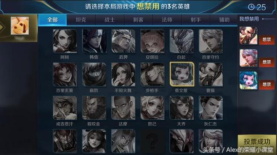 随后系统将统计票数,来禁掉本局比赛的英雄。如果出现票数相同的情况下,系统将会随机从中抽取一名英雄。