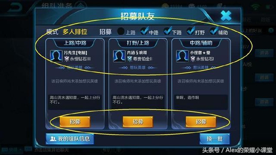 假如你自己选择了上路的话,那么你招募的队友就会去掉上路的位置,只招募其他位置的队友。