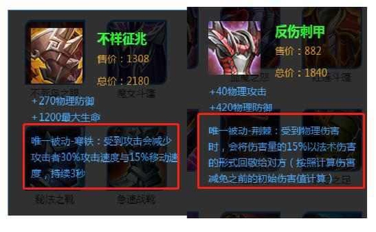 NO3、反伤装:反弹伤害和反制减速敌人的两件装备。也是玩家最容易搞错的两件装备,不祥征兆还好,基本所有的坦克英雄都通用,但是反甲就不一样了,可能很多玩家还都不知道,反甲是不能反弹护盾伤的,也就是英雄在有护盾状态下的时候是不能触发反甲的被动反伤的,比如有护盾的梦奇等。这个时候,梦奇再出反甲就不如出不祥征兆更有效果了。