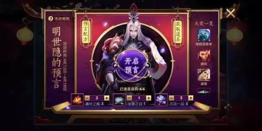 这里只要三样物品都加起来凑够6个就可以点击开启预言了,并不是说要每个物品都是等同的数才能开启哦。最让玩家想要等到的就是兰陵王的这款皮肤了。应该也是最有价值的奖品(兰陵王的上场几率视乎不高吧)。