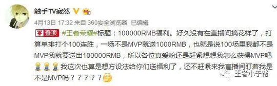 寂然自从直播以来,小编几乎还没见过他做过观众福利。如嗨氏为观众达排位上分,买英雄、买皮肤,和剑仙、张大仙送礼物等。现在居然也做了观众福利活动,单排上分冲100连胜,一场比赛不是MVP就送1000RMB,算下来刚好,100场都不是就100000RMB。但是小编心想就你这实力,又能送出多少。观众们也就白开心一场。