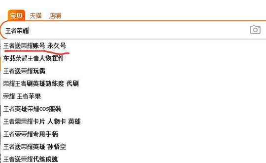 是否真假咱就看个热闹,毕竟50w买个王者荣耀账号这种事咱也做不了,但在网店搜索王者荣耀,下拉菜单就会弹出一些关联词,而拍第一的就是王者荣耀账号。