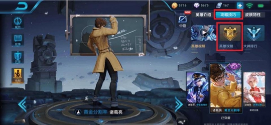 玩家只用通过游戏界面先点击左下角的英雄,选择一个熟练度在绿色或者绿色标志以上的英雄点开。之后点看右上角的攻略技巧,下方再次点看英雄攻略即可。