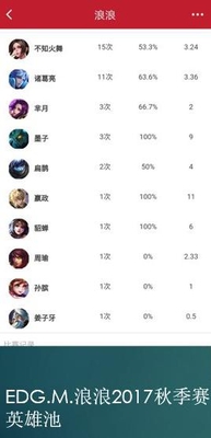 我们看下无痕的英雄池,这个是2017年秋季赛常规赛的英雄使用情况。无痕使用的,基本上都是吃经济的英雄,也就是边路刺客为主。而EDG.M主要的战术体系就是4保1,一家老小供应EDGM.初晨发育,然后拿出来毁天灭地。所以,在初晨拿到野核打野的时候,他和无痕是会存在冲突的。然而,当初晨使用射手打野类英雄的时候,无痕这种肉刺型选手就可以拿出来就可以和队伍很好的配合了。EDGM.浪浪的英雄池在目前版本需要进一步的扩充。