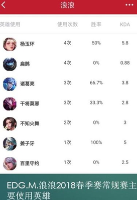 我们可以看下EDG.M.浪浪的两个赛季的英雄使用情况。这里很清楚的看到,浪浪在使用的自己拿手的诸葛亮的时候,胜率比在使用POKE型法师的时候要高些。辅助的话,他们现在使用的新人KOKO,目前来看还有待观察。
