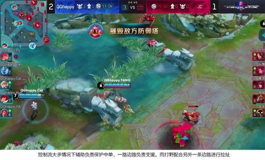这种打法的典型例子是BA黑凤梨和逆风情况下的Hero久竞。 它的核心思路是通过小规模的抱团,在上下两野区和边路反复进行拉扯,找寻对方失误的空档反打或是发育。 控制流的打法有很明显分队形式,大多情况下,辅助不再选择跟着打野,而是在中单附近做视野。