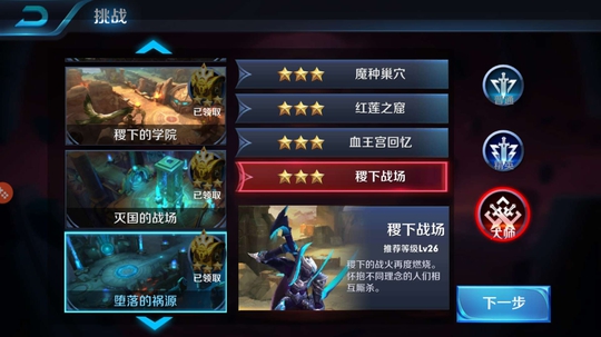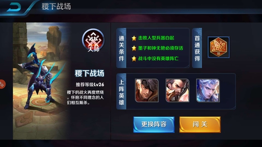 如图,模式是选用大师稷下战场,我的方法是选用夏侯惇当领头,另外两个用曹操和铠(也可以用选用程咬金等其他带回复的战士)。