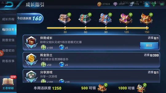 每周累计活跃度达到500可以获得200金币,达到1000可获得500金币。