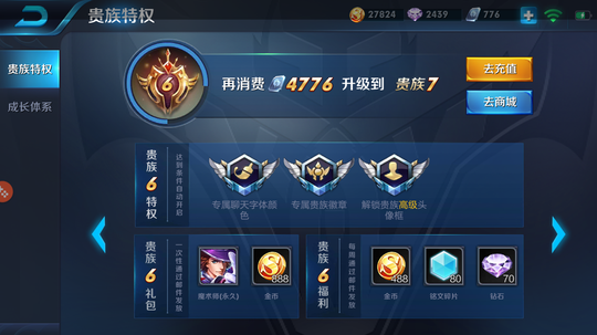 2、我是贵族6,在贵族特权里是488金币,大家可以根据自己的等级去查看对应的每周金币奖励。