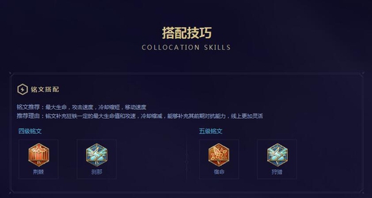 再来看看官方推荐的铭文吧,4级就不说了,5级推荐的是狩猎和宿命,反正小编还是用的百穿,感觉也可以的,专门为了一个英雄去做一套铭文还是划不来啊。