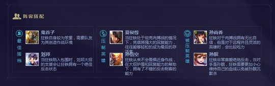 至于一些配合型英雄,基本上都是让狂铁能够自己顺利打出输出的。和赵云相比,我觉得狂铁的几个技能都要强上很多,唯一缺的就是灵活性了。所以说配合这方面强大的队友会比较好。而针对他的方法也很简单。他只有二技能一个位移,一旦没能对我们造成伤害,那我们就可以慢慢的放他风筝了。