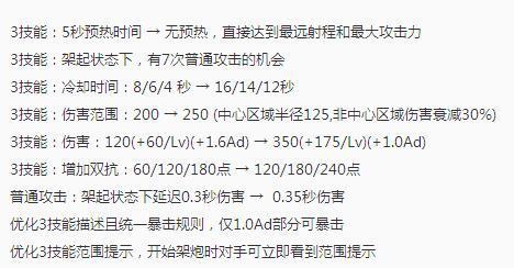 鲁班七号又来了一波小增强。1技能的cd和蓝耗都降低,同时2技能的cd也降低。另外,官方还优化了他的技能前摇,这样鲁班用技能来触发被动就显得更为简单。小编也在体验服试了几把,基本上一套连招可以比原来少接近一秒的时间,这在很多时候就比较关键了。