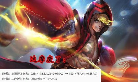达摩大幅度削弱,达摩的连招就是一技能突进,大招定墙,2技能破甲,然后大招二段释放造成斩杀伤害,血厚的,那就多补两下普攻。而现在,这样的调整,达摩大招还有多少威力可言?为了给射手让道,达摩已经废了!