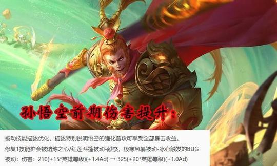 孙悟空最主要的调整就是被动的伤害,前期伤害直接提升了100来点,可以说加强幅度相当大,如果触发暴击,那么就是170多点的提升了。不过,AD加成下降,意味着后期的强度会比正式服下降一些。但孙悟空最大的问题就在于前期的发育,前期强势后,发育起来还是相对快了很多。