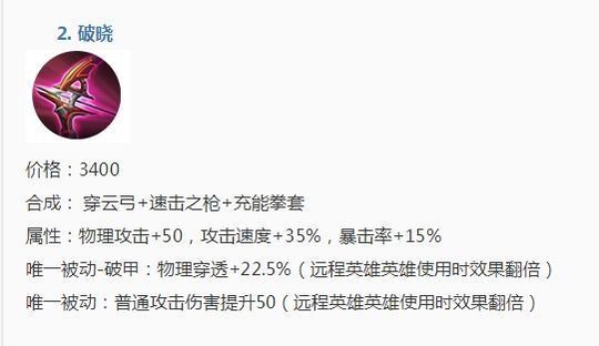 这件装备攻击、攻速、暴击、破甲兼备,真是射手后期必出大件,没有之一。与此同时,破甲弓改名为碎星锤,属性不变,不能和破晓叠加,可以前期过渡使用。