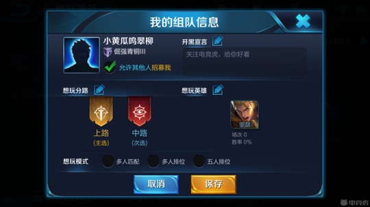 在招募队友时,我们可以填写自己的个人信息,来展示自己的游戏水平与擅长位置。是不是很像在相亲网站上展示我们自己的个人信息,等待有缘人的降临。