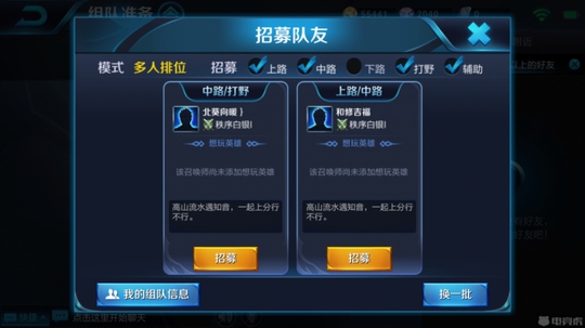 除了提前选择自己想要玩的位置外,在新版本中我们还可以招募路人玩家来与我们一起开黑,这就让许多单排的玩家形成互补,在阵容更合理的同时,还有助于游戏社交。