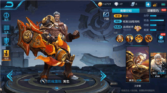 黄忠黄忠这名英雄也因其独特的技能机制,使得黄忠这个英雄在单挑缠斗方面十分强劲,其被动随着普攻命中目标时输出能力会越来越高,最强大的就是黄忠的大招技能十分强劲也十分少见直接在原地化身炮台一顿肆意轰炸。