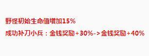 要说这个版本中哪个改变对局势的影响巨大,我觉得就是上面这两句话了。野怪初始生命值增加15%。同时,成功补刀小兵的金钱由30%增加到,40%这什么意思呢?就是野区的资源获取速度将会减慢,而线上的资源将会增多,这样一些靠打野发育的英雄就会受到一些影响。而射手也许会迎来一个春天,毕竟他们大部分时候都是在线上的。