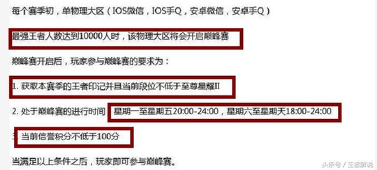 必须获得本赛季的王者印记,当前段位不能低于星耀2。也就是说必须是要上过王者段位并取得印记的玩家才有资格参与,而且最低段位不能低于星耀2。无论是开启时间还是信誉分要求都是可以理解的。但是这个段位要求真的很难让人接受,要知道这不是历史最高段位,而是当前的本赛季段位要达到最强王者。很多荣耀王者也不一定会有资格哦,因为还有个印记限制呢,也就是说你至少要达到过两次最强王者段位才有能参加巅峰赛。