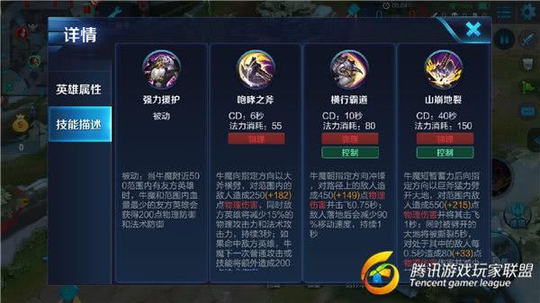 一技能-咆哮之斧:牛魔向指定方向以大斧横劈,对范围内的敌人造成物理伤害,同时敌方英雄将减少物理攻击力和法术攻击力,持续数秒;如果命中敌方英雄,牛魔下一次普通攻击或技能将额外造成法术伤害。
