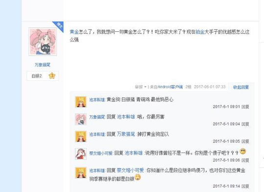 这位妹子随后参看了大神玩家的战绩,确实比较的厉害,怪不得又资格和脾气,怒喷自己家的黄金队友!不过她不服气,随后发帖怒怼铂金看不起黄金的玩家们,并且还说:“黄金怎么了,我就想问一句黄金怎么了?!吃你家大米了?现在铂金大手子的优越感怎么这么强?”
