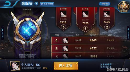 《王者荣耀》首个官方最强娱乐赛开启,最强实力之间的对决,王者与王者中的较量,并且只能单排,玩家能够在巅峰赛中获得额外的荣耀战力和全英雄战力加成,新模式令人期待。