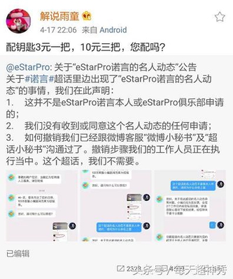 eStar俱乐部的态度同样相当嚣张,官博在原文中写道:这个超话,我们不需要!多位电竞圈人士无法接受这样的说法,解说雨童写道:配钥匙3元一把,10元三把,您配吗?