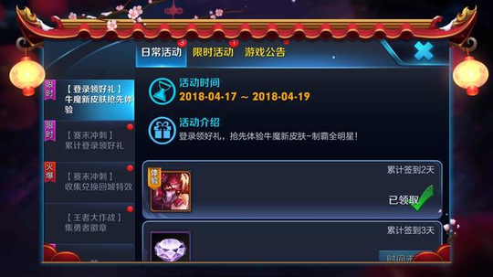 领取指南:在活动面板中,有一个登录领好礼的皮肤活动,累计签到2天就可以直接获得体验卡了,这款皮肤会在4月27日凌晨0点6元限时直售。