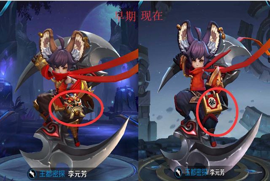 李元芳早期和现在的对比,腰间的装饰物变了,早期的是个面具(是不是阿轲送的呢),现在的变成了一个秘密的秘,里面会有什么秘密呢。还有就是头发的颜色也做了一些调整。