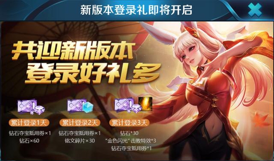 其次在游戏内,已预热了新版本活动,这也是新版更新在即的先兆。命运结契版本更新后,每日登录即可获得钻石夺宝券,累计登录三天还能获得首个击败特效:金色闪光。