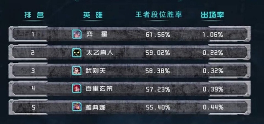 再来看看王者段位的胜率,第一名就是奕星这个新英雄,是不是有的人没想到呢?他的1,2技能是比较强大的消耗技能,不过能成为胜率第一关键还是靠大招,绝对是改变团战局势的神技,一个大基本可以把对方分割成2段,团战肯定就比较好打了。