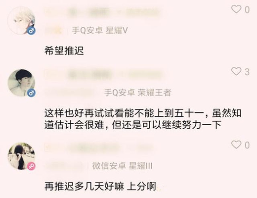 不过这里小编感觉以天美以往的作法来说:“想要补偿门都没有,就算有也只是一点点而已。”那么对于此次新赛季延迟到底是好是坏呢?网友可是持有不同的意见。有的玩家表示:“为了能获得更多的奖励,延迟两天更新有助于我重新将段位打上去”不过对于另一部分玩家来说他们认为:“好不容易刚刚努力打上王者,如果在排位掉分了那么岂不是亏大了?不能排位这几天荣耀还怎么玩?”