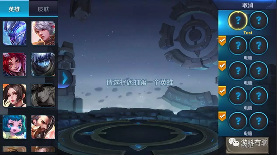 在选择英雄界面上,系统会随机给召唤师提供50个英雄。支持每个召唤师分别选择第一、第二两个英雄,并分别配置两个英雄的铭文,皮肤,召唤师技能。