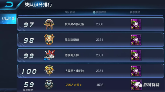 另外,到赛季结束的时候战队也会发放赛季奖励。而排名前100的战队队员则会得到高渐离的 死亡摇滚 皮肤。